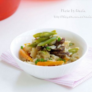 盖上料理盒盖,700W微波火力加热15分钟(最好每5分钟取出翻拌一次),焖2分钟即可。