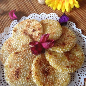 把滚好的小球放入芝麻中,滚几圈均匀粘上芝麻,再轻轻压扁成饼状。