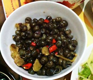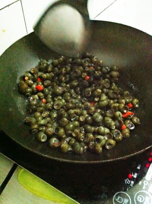 锅烧干后加入油、辣椒,烧热后加入螺丝(用螺丝时再将其洗两遍控水加入锅中),大火翻炒两分钟加入料酒、翻炒两下加入酱油,继续翻炒一分钟再加入生姜,随后再炒四至五分钟