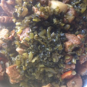 过节菜多忙,前面没拍,前夹肉连瘦带肥切小块,锅预热放油姜片爆香,下肉炒5分钟加酱油翻炒放适量水烧开焖15分钟,倒入雪菜。