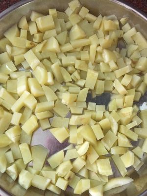首先准备好所有食材后,把土豆洗净削皮切成粒状,玉米扒皮