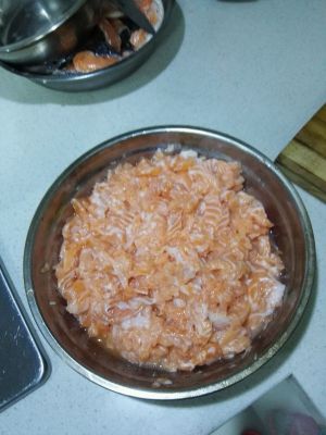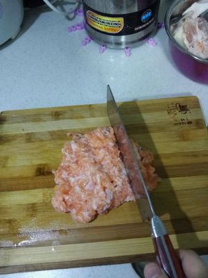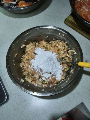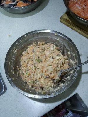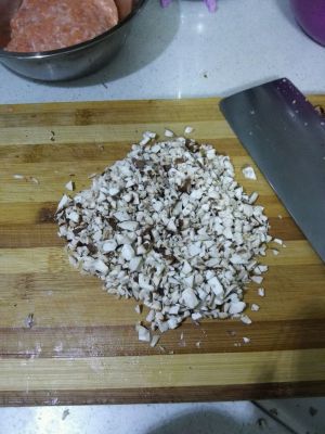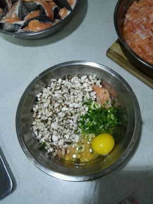 剁好的鱼肉里放入剁好的香菇末,葱末,鸡蛋,盐,糖,味精,拌匀