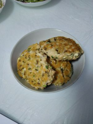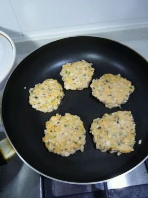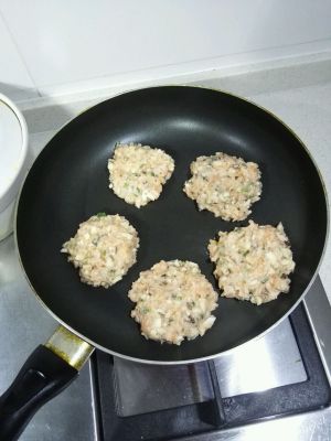 平底锅烧热,不需要放油(三文鱼本身就很油),放入肉饼,煎到金黄