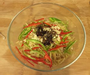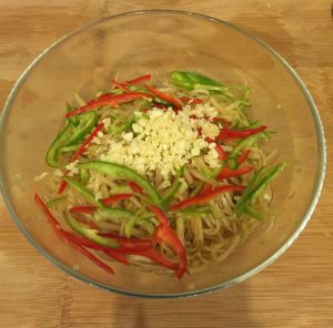 加入红、青辣椒丝,并在上面撒上蒜末。