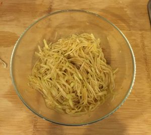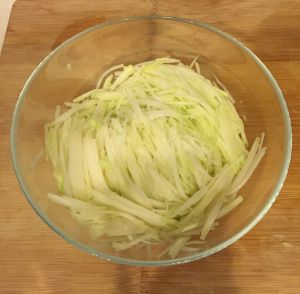 切成细丝,越细越好但不要擦出来的,不劲道。加盐腌制10分钟。