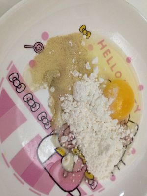 盘子里打入一个鸡蛋,放一点点胡椒粉和盐,再放少许面粉,搅拌成糊。