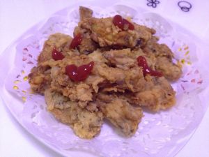 炸好捞上来,可以开吃了,超级的香脆啊。本来还想用洋葱粒跟番茄酱,加点淀粉水勾个欠,用其中一半的鸡翅在里面翻炒一下,撒点白芝麻,就变成韩式炸鸡了,这样可以有两种口味,不过我妈要用锅来炒茄子,最后放弃了,下次吧。