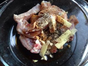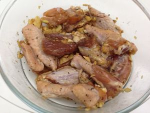 3只鸡翅其实是全翅,被切成小块。洗干净,放入蒜末,姜片,胡椒粉,罗勒叶碎,生抽,盐。