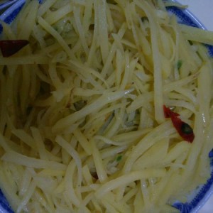 然后放入土豆丝翻炒,放点糖盐还有鸡精(这个可以根据自己的口味添加的。)