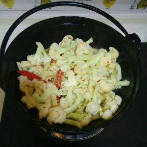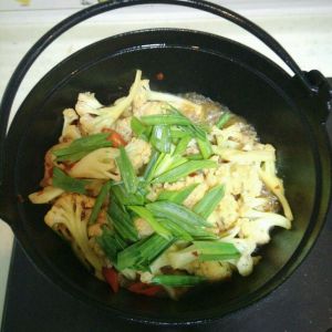 倒入红辣椒段和花菜,翻炒几下,加入一汤匙生抽,少许白糖,继续翻炒一分钟左右;