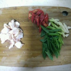 五花肉切成薄片,小红辣椒斜切成段,青蒜也斜切成段,然后将蒜青和蒜白分开;