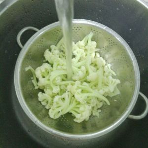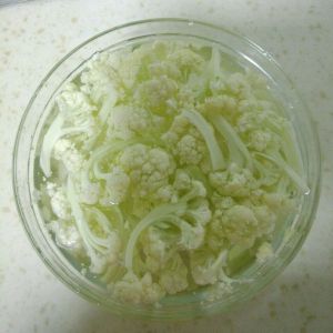 花菜洗净用刀切成小朵, 放入淡盐水中浸泡15分钟;