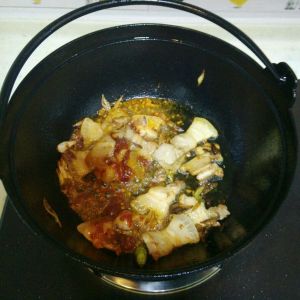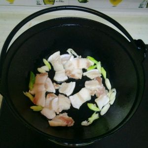 铁锅放油烧热,下蒜白部分爆香,放入五花肉片入锅,用中火煸炒至表面略焦,把肥肉部分的油份逼出一部分;