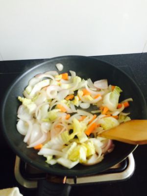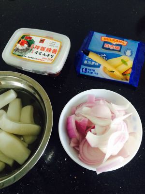 买回来的年糕条清洗后放入刚烧开的沸水中烫一会,捞起后放凉水中备用。平底锅中加入适量油,油热后加入洋葱炒出香味,再依次加入白菜和胡萝卜一起翻炒均匀。