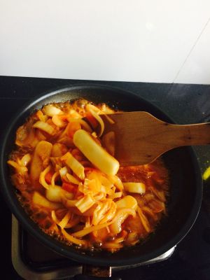 加入开水和年糕后慢慢搅拌,依次倒入生抽、番茄酱和韩国辣酱调味,放入两片芝士片。盖上锅盖焖煮一会,等稍微收汁后就可以起锅装盘了。