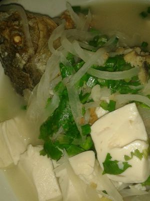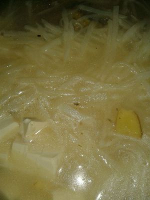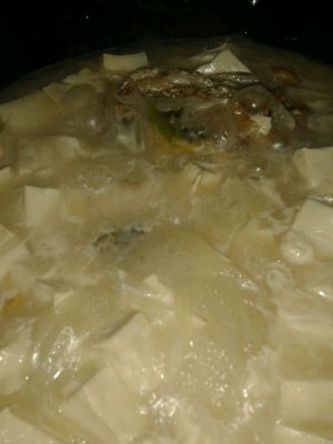 盖锅盖汤煮至奶白色,豆腐切小块,和白萝卜丝一起放入锅中。