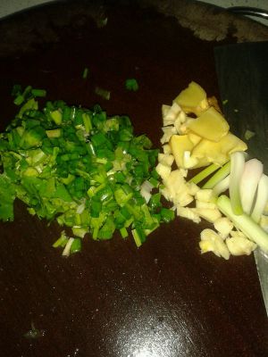 姜洗净切片;蒜切丁;小葱洗净,葱白切段,其余切碎;香菜洗净切碎。
