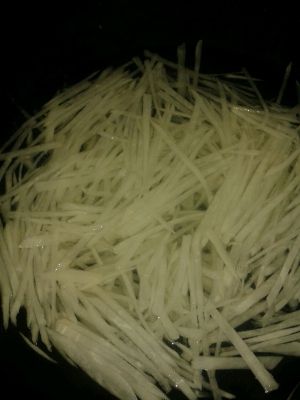 白萝卜去皮,切丝,锅中烧开水,放入白萝卜丝,煮开后捞出。