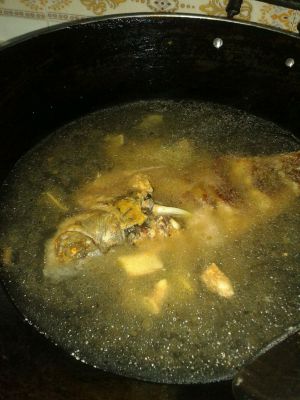 锅中留底油烧热,放入葱白段、姜、蒜爆香,加入煎好的鯽鱼,鲫鱼上淋上料酒,翻炒一下,加入适量开水。