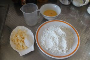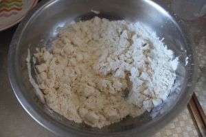黄油60g切小块,面粉150,蛋液20g,水25g和糖倒入盆中,用筷子搅和一下。然后用手压成面团,不要过分的揉。