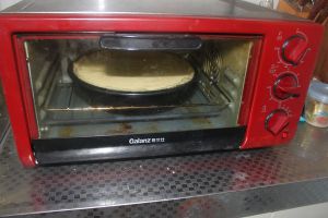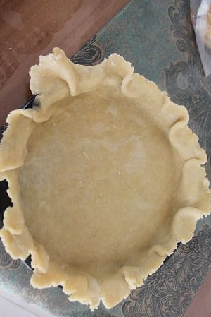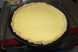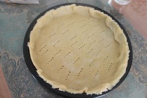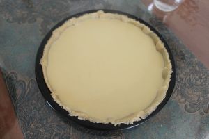 然后开始制作挞皮,把面团擀成一个比模具大的薄皮,我用的八寸的比萨盘,放入模具中,边上压出自然的褶子,再把多出来的面皮部分,顺着边儿用刀去掉就好了。为什么要弄这褶子,是因为大阪芝士挞就有这种褶子。