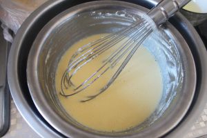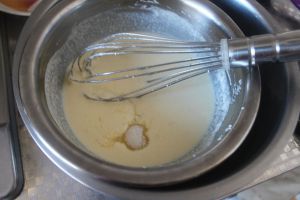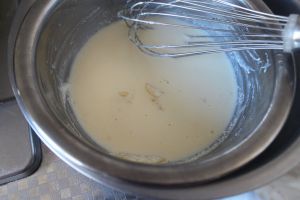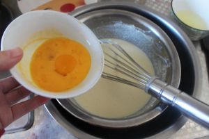 然后用刚刚做挞皮剩下的半个鸡蛋全蛋液,再加一个蛋黄,分三次加入到芝士液中。每一次都要打匀。