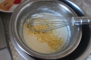 然后加入车达奶酪打匀,最后再加入马苏里拉,这个过程需要多搅打,每一步都要打顺滑,我用的手动打蛋器,省事就用电动打蛋器低档好了。