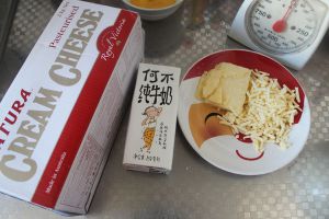 面团醒发的同时准备奶酪,用了30克的马苏里拉,30克的车达,110克的奶油奶酪。目的是融合几种奶酪的味道,使口感更丰富。
