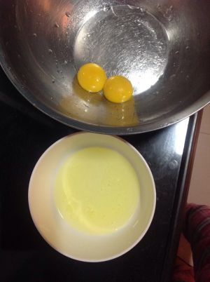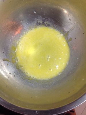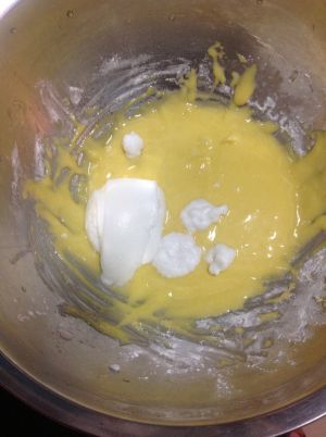 蛋白三分之一加入蛋黄液搅拌均匀后再把剩下的都倒下去搅拌均匀。