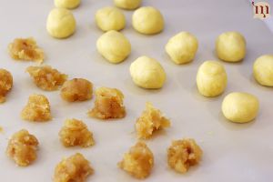 将冷藏好的面团整理成更细长条形,用电子秤将其切分成等重的小块整理成球状。同样将菠萝馅也分成等份的几个小球。