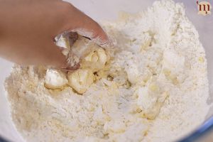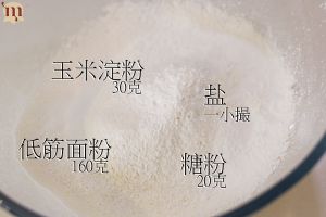 制作酥皮:将面粉、玉米淀粉、糖粉和一小撮盐筛到一个大容器内,稍稍混合下。