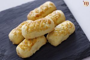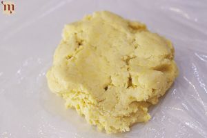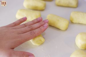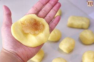 把圆球状的酥皮胚用手掌心压成椭圆装,在一端摆上一块冷却的菠萝馅。