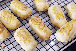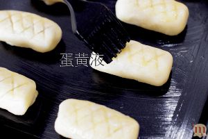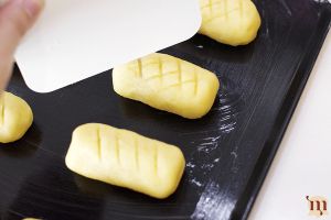 把整理好的菠萝挞放在刷有一层黄油或其他无味食用油的烤盘上。用刮刀在包好的菠萝挞表面划几下让其有类似菠萝的纹路。