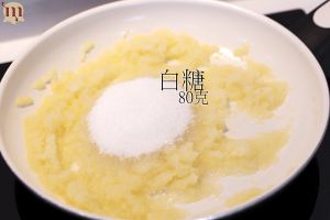 加热至菠萝汁减少的差不多出现块状时,倒入白糖稍稍混合下。