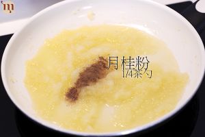 加入月桂粉, 转为中小火,搅拌均匀后继续加热。