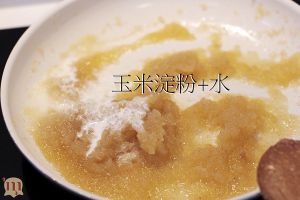 当液体出现稍比果酱再稀一点的浓稠度时,倒入之前混合好的玉米淀粉液体。