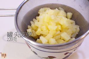 制作菠萝馅:将菠萝块沥干水分。玉米淀粉中加入一勺水,搅拌均匀放在一旁备用。
