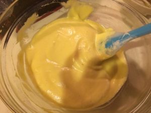 接着把打发好的蛋白倒入蛋黄液中,以翻拌的手法搅拌均匀,也就是像炒菜一样上下翻动
