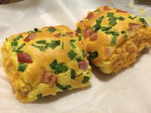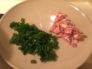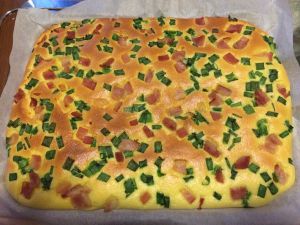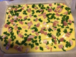 将蛋糕糊均匀的倒入烤盘里,表面弄平,再震两下,把里面的气泡震出来,最后在表面撒上切好的香葱和培根即可,放入预热好的烤箱里,175度上下火,烤18分钟
