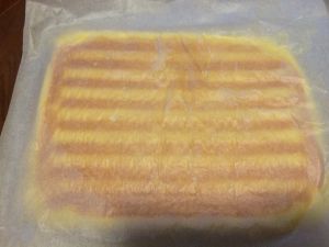 再准备一张干净的油纸,把蛋糕倒扣上去,等稍微冷却一点立马撕下上面的油纸