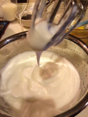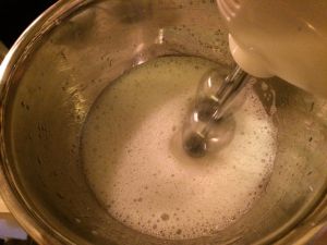 下面打发蛋清,可以加入一点泡打粉或几滴柠檬汁以便更快起泡