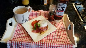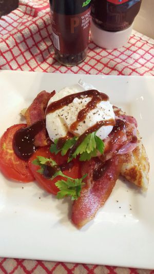 这就是最后的成品图了。棕色的酱叫brown source, 英式早餐里经常使用的一种酱,酸酸的,有咸味。再搭配点现磨黑胡椒