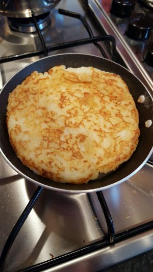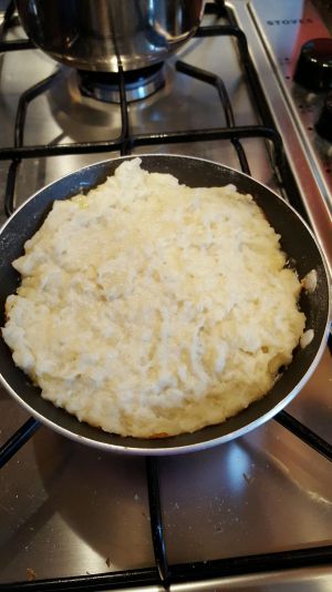 用一点干面粉撒在和好的薯泥上然后压成一个大约一厘米厚的饼放在平底锅里用小火煎,每面8分钟左右