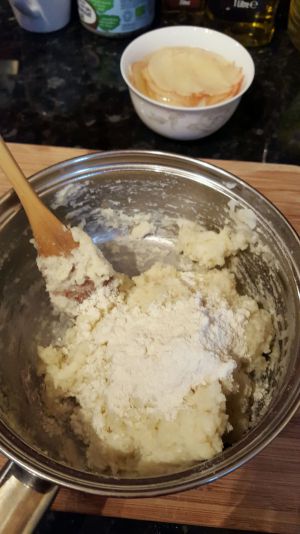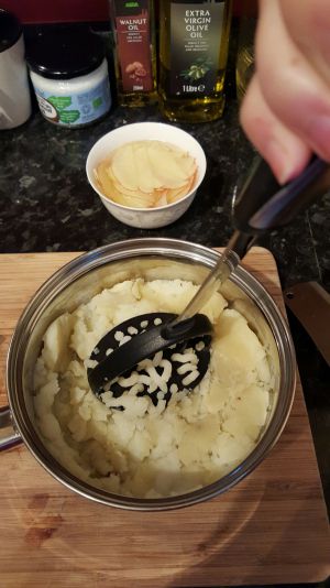 土豆煮熟放凉点后去皮,用厨房纸吸干多于水份,或者放在一个锅里烘干。放20克黄油一起压成泥