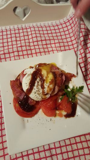 然后就是把培根和西红柿煎一下,最好是微焦,这样比较香,看起来也漂亮。再配上一个水煮的半熟的鸡蛋,放点绿叶蔬菜摆盘