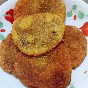 盘里倒入面包糠,将做好的饼放入盘里两边裹上面包糠,全部做好后,吃多少煎多少,一次吃不完用保鲜膜包好放冷冻,下次直接拿出来煎熟就可以