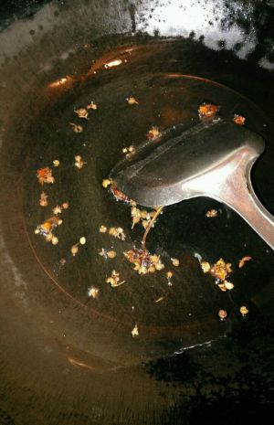 锅中倒油,放花椒,八角小火慢炸,炸到花椒八角微焦。有香叶可以当几片香叶。然后关火,捞出花椒八角不要。