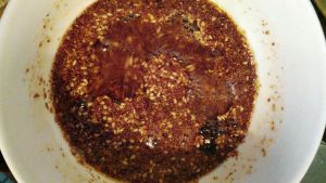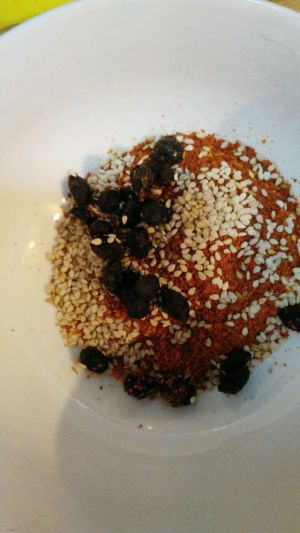 拿一个干净无水的碗,放入辣椒粉,白芝麻,豆豉。