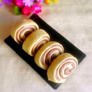 白色的面团放一个鸡蛋,200克的粉,70毫升的牛奶,2.5克的酵母,30克的糖粉揉成团状,有面包机的可以用面包机揉,那样方便些,如果没有面包机的酵母得先用一点温水化开再揉面