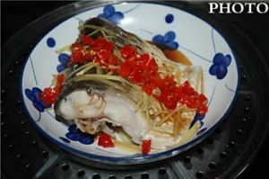 把盘子里的水倒掉,淋上蒸鱼豉油,加上红剁椒。再蒸3.4分钟。